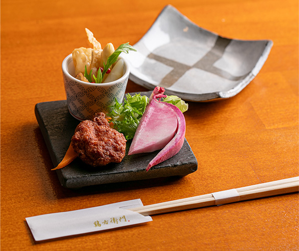 当店の〝付き出し〟は、さつま地鶏を交えた